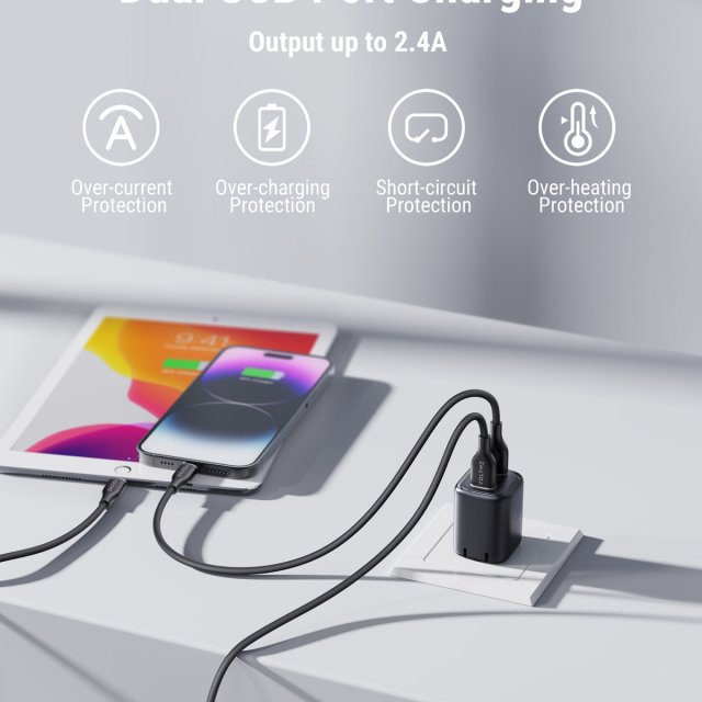 • Dual USB Output: Charge two devices simultaneously with 5V 2.4A total output for fast, reliable charging.
