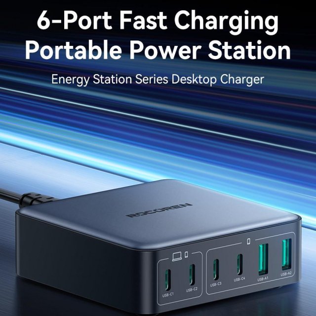 200W 6-Port GaN Fast Charger with USB-C and USB-A Desktop Power Station