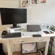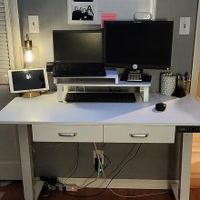 I've been on the hunt for the perfect desk to suit my needs, and I'm thrilled to have found it. This standing desk is everything I could ask for and more The adjustable height feature has been a lifesaver - no longer do I need to hunch over my laptop all day long, causing strain on my neck and shoulders. With just a press of a button, the electric adjustment works like magic allowing me to easily switch between sitting and standing positions throughout the day. The addition of dual drawers is an absolute bonus! They offer ample storage space which helps keep my workspace neat and organized. No more cluttered desk surface with papers strewn about everywhere - everything now has its place in one of these drawers. But what sets this desk apart from others in the market is its mobility thanks to those nifty casters at the bottom. It's such a breeze moving it around as needed without any hassle or heavy lifting involved. Moreover, despite being compact enough to fit into tight spaces comfortably, there's no compromise on sturdiness even when fully extended – absolutely no wobbles or shakes whatsoever! It’s clear that careful thought went into designing this product combining functionality (adjustable height) with convenience (drawers & wheels). In short, this new addition has made working from home so much easier than before while also boosting productivity levels significantly 🚀 To anyone looking for their perfect workspace solution – look no further!