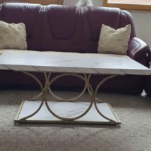 The table’s top tier features a luxurious faux marble finish, not only adding an element of sophistication but also boasting waterproof, scratch-resistant qualities for ease of maintenance. The stylish metal base, with its intricate circular and arc design, transforms what could be just a simple table into a remarkable piece of art. This coffee table doesn’t just stand—it captivates.