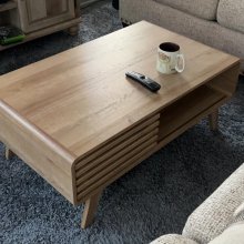 This coffee table is so chic and functional. The wood slat sliding door gives it character while providing ample storage space.